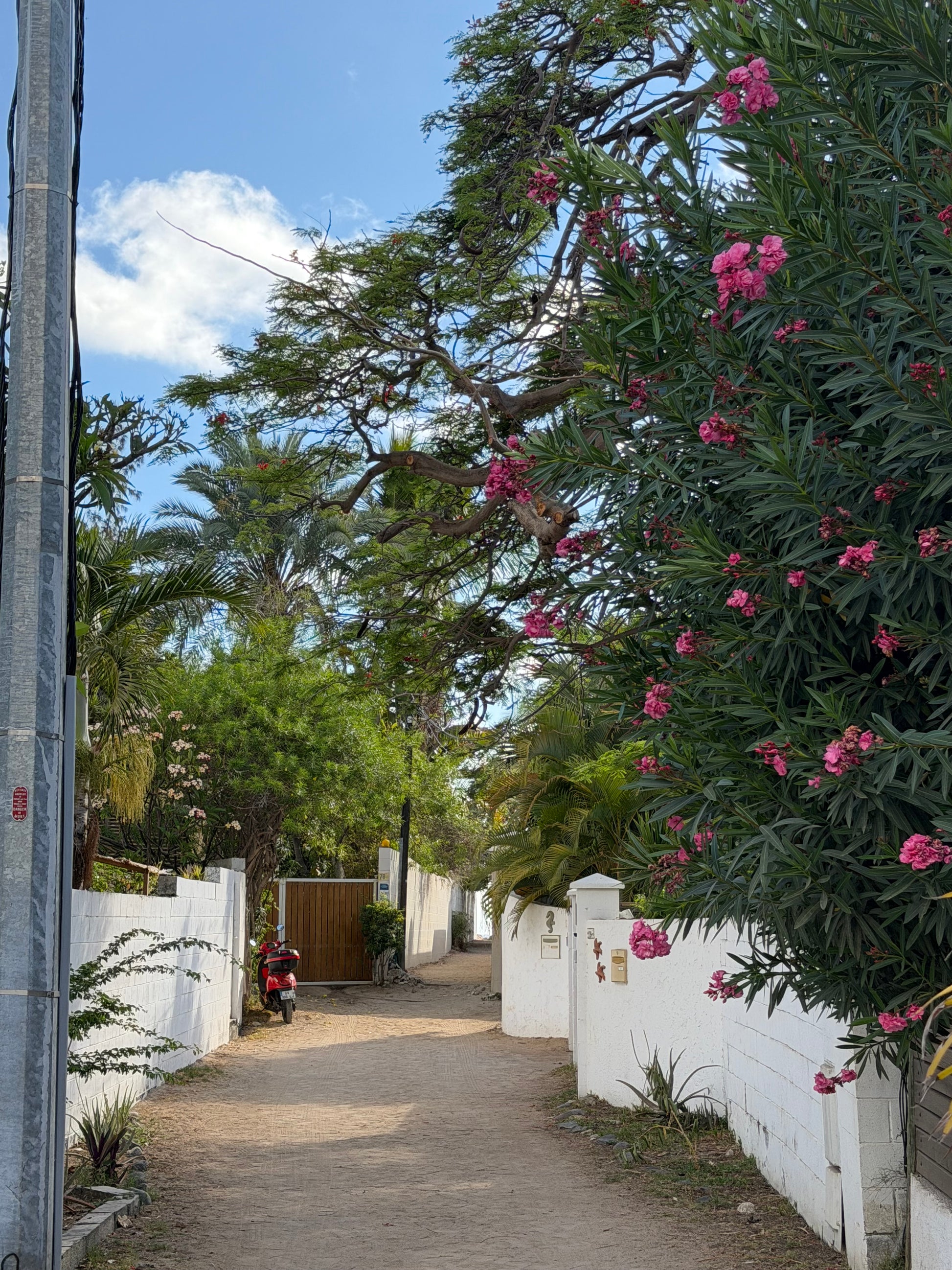 Ce chemin, je l'ai emprunté des dizaines de fois. Jamais je ne l'ai trouvé banal. Les murs blancs, les branches qui penchent, le sol sablonneux — c'est le sas entre le quotidien et la mer. L'endroit où le rythme change, sans qu'on s'en rende compte.