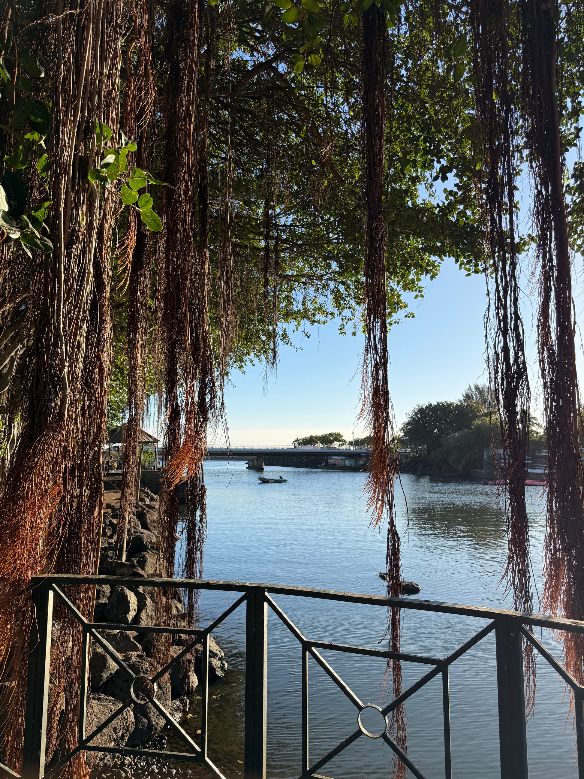 Rivière d'Abord, en fin d'après-midi. Les racines du banyan tombent comme un rideau naturel. L'eau est presque immobile. Un bateau posé là, sans impatience. Plus loin, le pont entre le centre-ville et Terre-Sainte — qu'on traverse souvent sans y penser. Ici, j'ai décidé de m'arrêter. Et de regarder ce que Saint-Pierre cache, juste à côté de ce qu'elle montre.